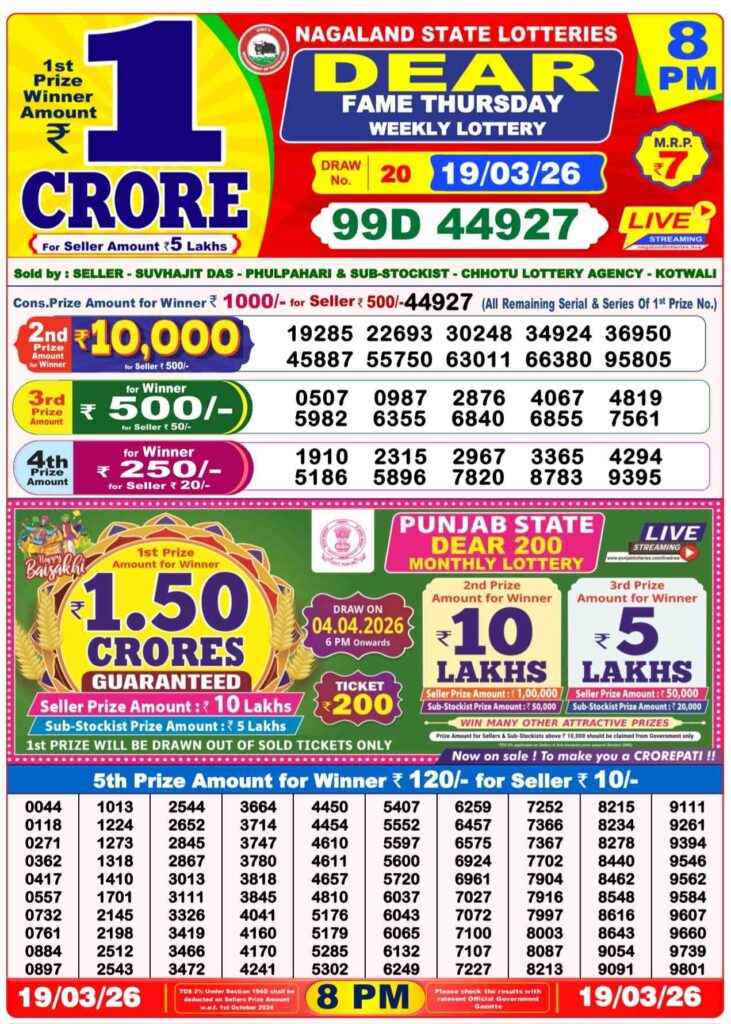 Dhankesari Today Result 20.3.2026 Lottery Sambad 1PM, 6PM and 8PM: Are you daily serching for the most lovely and peoples most favourite Dhankesari lottery results 11am morning, 4pm day and 8pm evening result and friends it will be your life chnager oppertunity where you know that this special post and all the other diffenrt posts can be daily been updated with lottery sambad results and friends there you can win many cash prize like first prize of 1 crore rupees and friends if you needs the fastest delivery of the results then do us been shortcut as the site name which has been named as Dhankesrai lottery so its the another great morning of of Wednesday 18th of March 2026 so friends its the peoples most searhced as popular sambad lottery which will be alwyas been greatly known to be as Dhankesari lotteries and you know that in this post will be always updated in the best timing at 1:10pm, 6:10pm and 8:10pm.