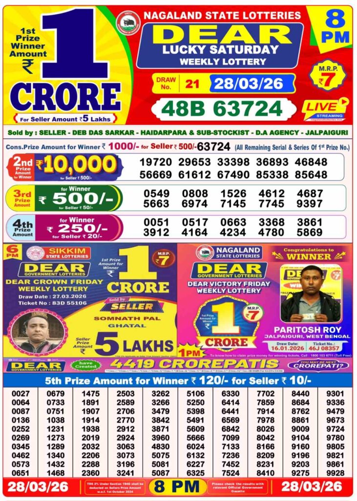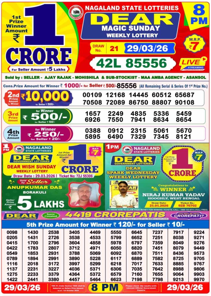 Dhankesari Today Result lottery sambad result today is updated every day by its new Nagaland state lottery or it can be said as lottery sambad which are known as 11:55am morning, 4pm day and 8pm night, these lotteries is under the lotteries named as sikkim state lottery, west bengal state lottery and nagaland state lottery. For the latest winning numbers and complete updates, you can always check the official draw at Lottery Sambad.