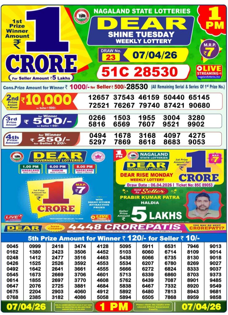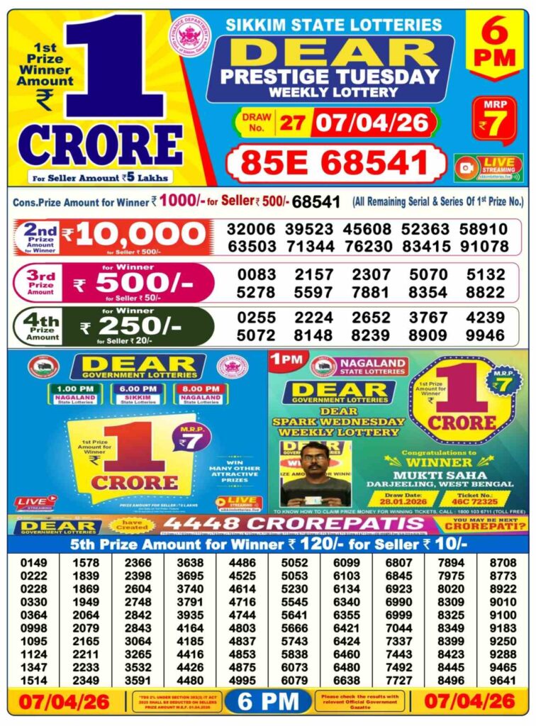 Dhankesari Today Result 7.4.2026 Lottery Sambad 1PM, 6PM and 8PM: Good morning my dear friends there you are in this special post is updated with the Dhankesari lottery results 11am morning, 4pm day and 8pm evening result and my dear viewers you know that all the different posts can be alwyas posted the most lovely and peoples favourite sambad lottery and there you can win the first prize of 1 crore rupees and if you wants the fastest delivery of the results then do us been shortcut as the site name which is Dhankesrai lottery so its the another great morning of Monday new week started 6th of April 2026 so sambad lottery can it be alwyas been proudly knwon to be as Dhankesari lotteries and you know that in this post will be always updated in the best timing at 1:10pm, 6:10pm and 8:10pm.