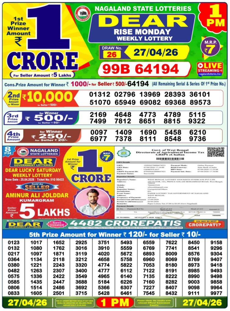 Dhankesari Today Result 26.4.2026 Lottery Sambad 1PM, 6PM and 8PM: There you are in this lovely website where you getting named to be as alwyas Dhankesrai lottery which is one of the most fastest website where you daily updated with the lottery sambad results and friends you can getting the chance to win many cash prize and first prize of 1 crore rupees and other cash prizes and friends there you know that this special post can be prouldy updated with the most latest Dhankesari lottery results 11am morning, 4pm day and 8pm evening result and my dear viewers you know that its the another great day of Saturday a lovely weekend means 25th of April 2026 so its days sambad lottery which will be alwyas been prouldy known to be as it will be been Dhankesari lotteries and you know that in this post will be always updated in the best timing at 1:10pm, 6:10pm and 8:10pm.