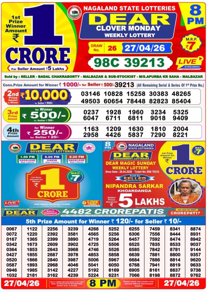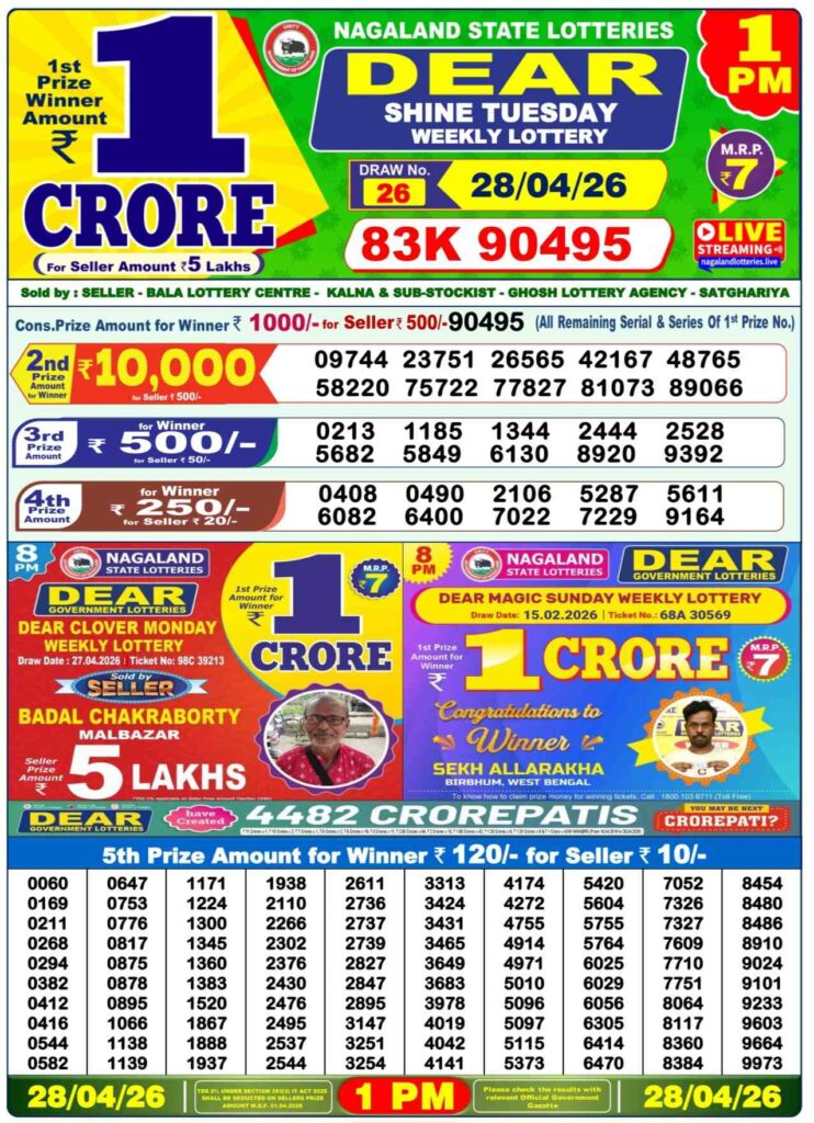 Dhankesari Today Result 27.4.2026 Lottery Sambad 1PM, 6PM and 8PM: Good morning my dear friends there you are here for the Dhankesari lottery results 11am morning, 4pm day and 8pm evening result and there you know that all the differnt posts can be daily gives you the oppertunity to win many cash prizes like 1 crore rupees and all the posts updated with the lottery sambad results and if you alwyas needs the fastest dleivery of the results then do us been created bookmarked as the site name which has been named as Nagaland state lottery so its the another new week strated means Monday 27th of April 2026 so its days sambad lottery which will be alwyas been grealt named to be as Dhankesari lotteries and you know that in this post will be always updated in the best timing at 1:10pm, 6:10pm and 8:10pm.
