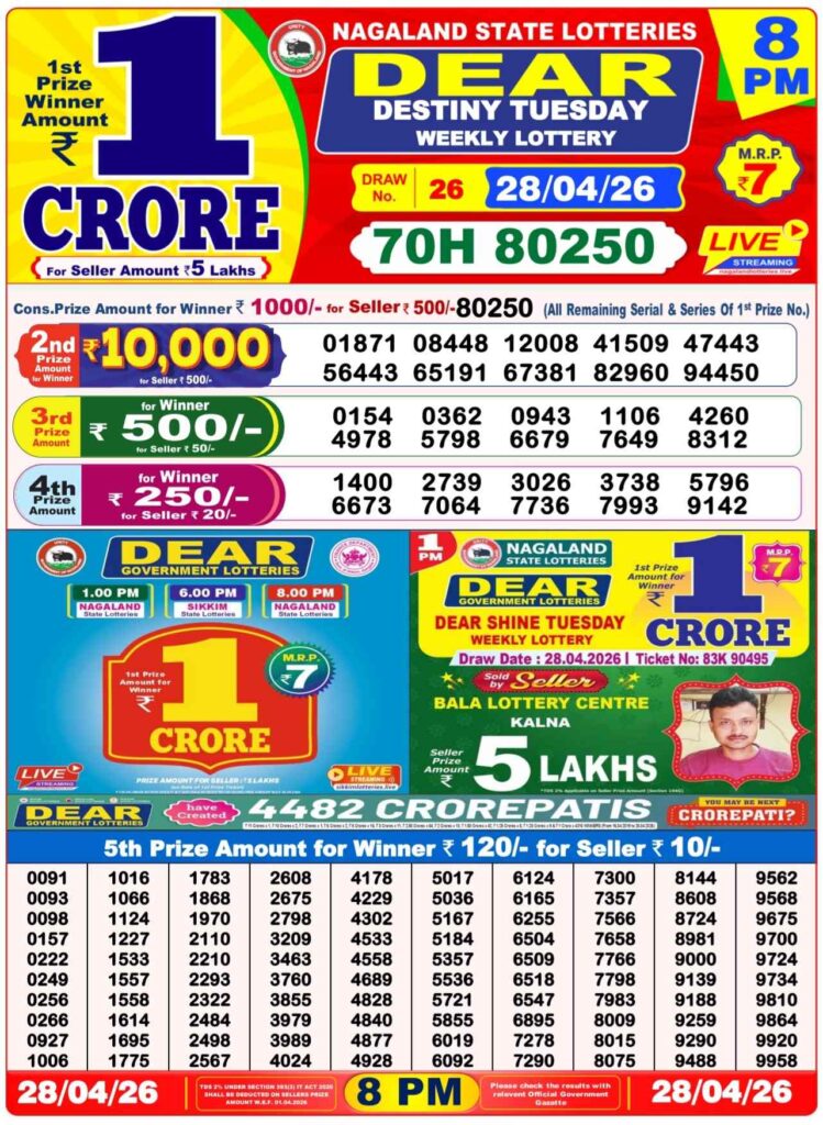 Dhankesari Today Result 28.4.2026 Lottery Sambad 1PM, 6PM and 8PM: There you are in this special website which has been alwyas been greatly known to be as Dhankesari lottery which has been always been greatly updated with the most latest lottery sambad results and and try your like with us and take daily chance and there you can win first prize of 1 crore rupees and other cash prizes and this special post can be updated with the most popular Dhankesari lottery results 11am morning, 4pm day and 8pm evening result and friends this is the another great morning of Tuesday 28th of April 2026 so its days most popular and peoples favourite sambad lottery which will be alwyas been greatly named to be as it will be Dhankesari lotteries and you know that in this post will be always updated in the best timing at 1:10pm, 6:10pm and 8:10pm.