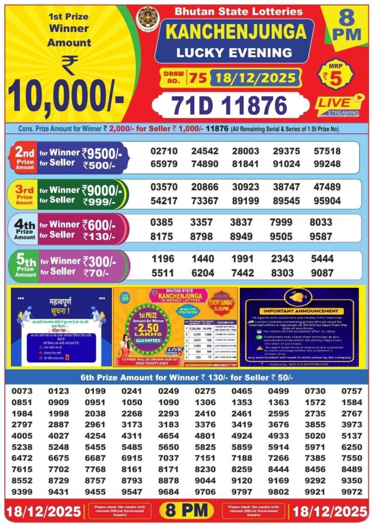 Bhutan Lottery Result Today 19.12.2025 Today 11:55AM 4PM 8PM: Are you daily been searching for the most lovely and peopels favouite Bhutan lottery result 11am morning, 4pm day and 8pm evening result and dear friends all the different posts can be updated with the peopels most favourite and most awesome sambad lottery where you daily gets the chance to win the first prize of 1 crore rupees and dear friends if you wants the fastest delivery of teh reuslts then you can do us been shortcut as the site name which is named to be as Dhankesrai lottery and its the day of Wednesday 17th of Decmeber 2025 sambad lottery which will be alwyas been prouldy knwon to be as it will be Bhutan lotteries and you know that in this post will be always updated in the best timing at 12:10pm 4:10pm 8:10pm.