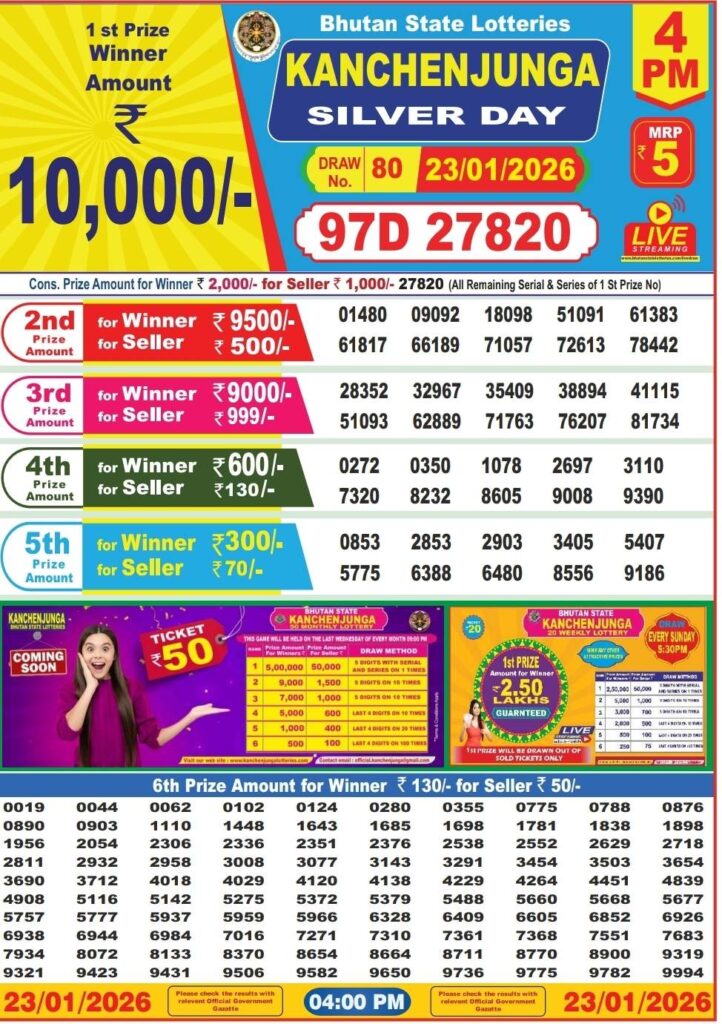 Bhutan Lottery Result Today 24.1.2026 Today 11:55AM 4PM 8PM: Good morning my dear friends there you are in this special post is about for the most lovely Bhutan lottery result 11am morning, 4pm day and 8pm evening result and you know that we are India’s most popular website where you daily found for the most lovely and peoples most favorite sambad lottery and win the first prize of 1 crore rupees and if you needs it the fastest way then you can do us been created shortcut as the site name which has been named to be as Dhankesrai lottery so friends its the day of great Friday 23rd of January 2026 Happy Saraswati puja to you all so this great mornings most lovley sambad lottery being greatly named to be as Bhutan lotteries and you know that in this post will be always updated in the best timing at 12:10pm 4:10pm 8:10pm.