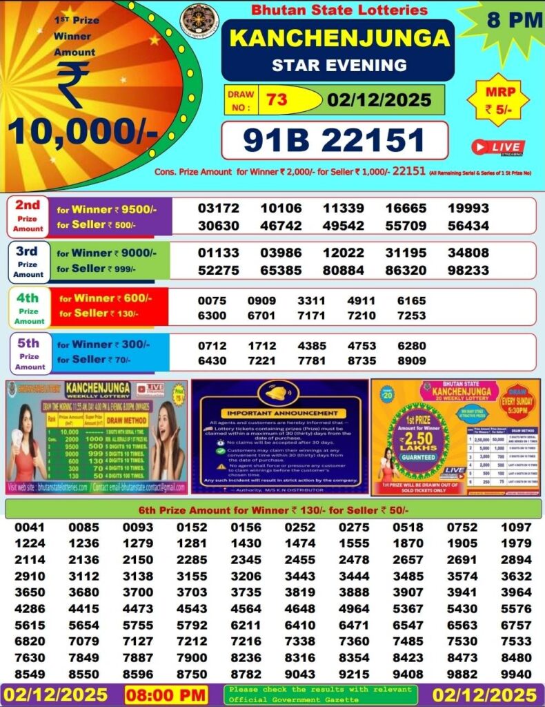 Bhutan Lottery Result Today 2.12.2025 Today 11:55AM 4PM 8PM: Good morning my dear viewers there you are landed at the site which has been known to be as Dhankesrai lottery one of the most popular website where all the different posts can be updated with the most latest and peopels most lovely lottery sambad results and there you can be rich with us and try your luck daily with us and this special post can be udpated with the most lovely Bhutan lottery result 11am morning, 4pm day and 8pm evening result and its the another great morning of tuesday 2nd of December 2025 its days most lucky peoples most searched sambad lottery which will be alwyas told to be as Bhutan lotteries and you know that in this post will be always updated in the best timing at 12:10pm 4:10pm 8:10pm.