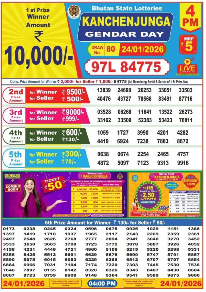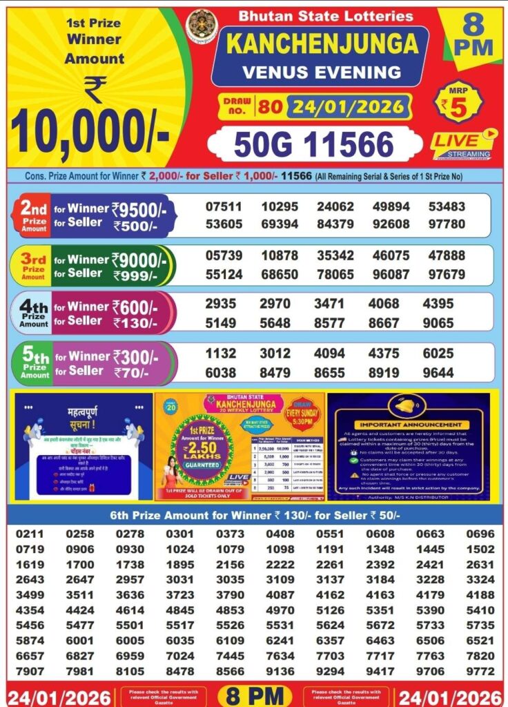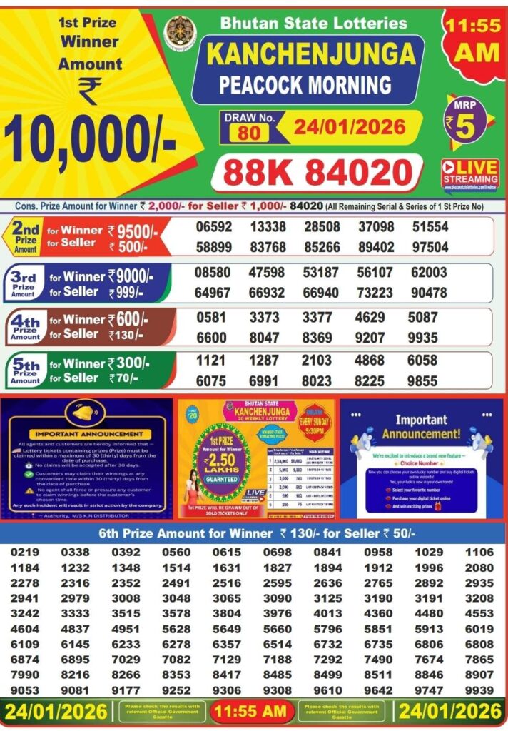 Bhutan Lottery Result Today 25.1.2026 Today 11:55AM 4PM 8PM: There you are in this great website which has been getting named to be as it will be Dhankesari lottery one of the most legit website where you daily gets the chance to win an incrdible amount of money like 1 crore rupees with the most lovely lottery sambad results and friends there you know that this special post is daily been for Bhutan lottery result 11am morning, 4pm day and 8pm evening result and this is the great day of lovely weekend means Saturday 24th of January 2026 so this days most lovely sambad lottery which will be knwon to be as Bhutan lotteries and you know that in this post will be always updated in the best timing at 12:10pm 4:10pm 8:10pm.