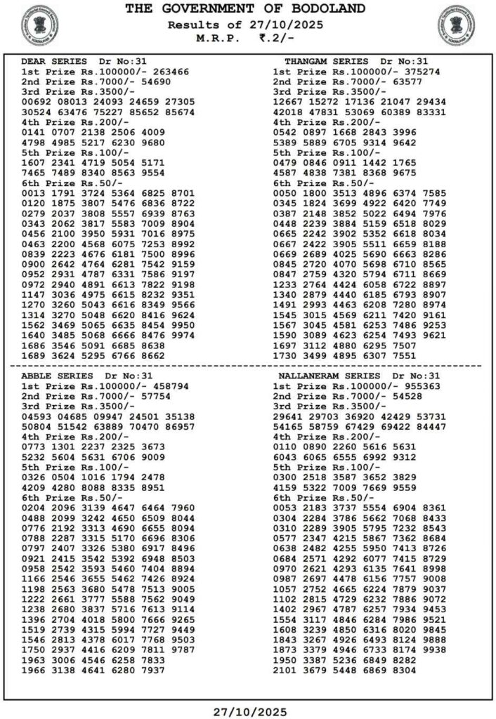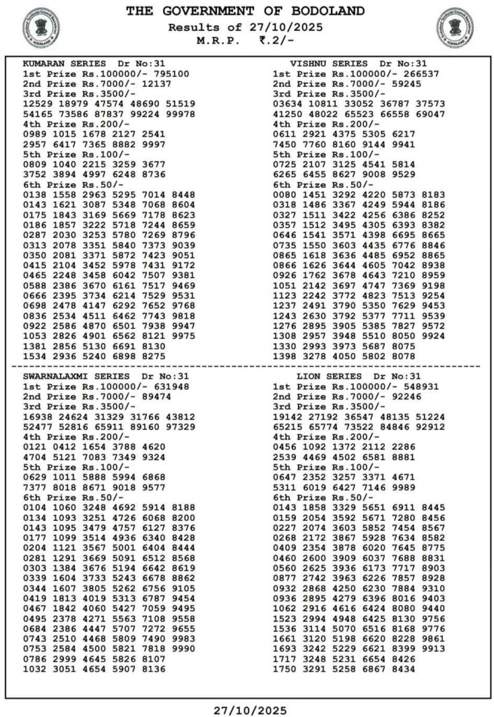 Bodoland Lottery Result Today 3PM 27.10.2025 Assam State Lottery: Good day my dear friends there you are in this website which has been known to be as Dhankeasri lottery and friends there you know that this special post and all the other diffenret posts can be updated with the most popular lottery sambad results and friends daily many peoples gets the first prize of 1 crore rupees and friends there this specail post can be udpated with your favourite Bodoland lottery results 3pm day result and frineds its the another great morning of Monday a new week means 27th of October 2025 its days peopels most lukcy sambad lottery whch will be alwyas been told to be as it will be Bodoland lotteries and you know that in this post will be always updated in the best timing at 3:10pm.