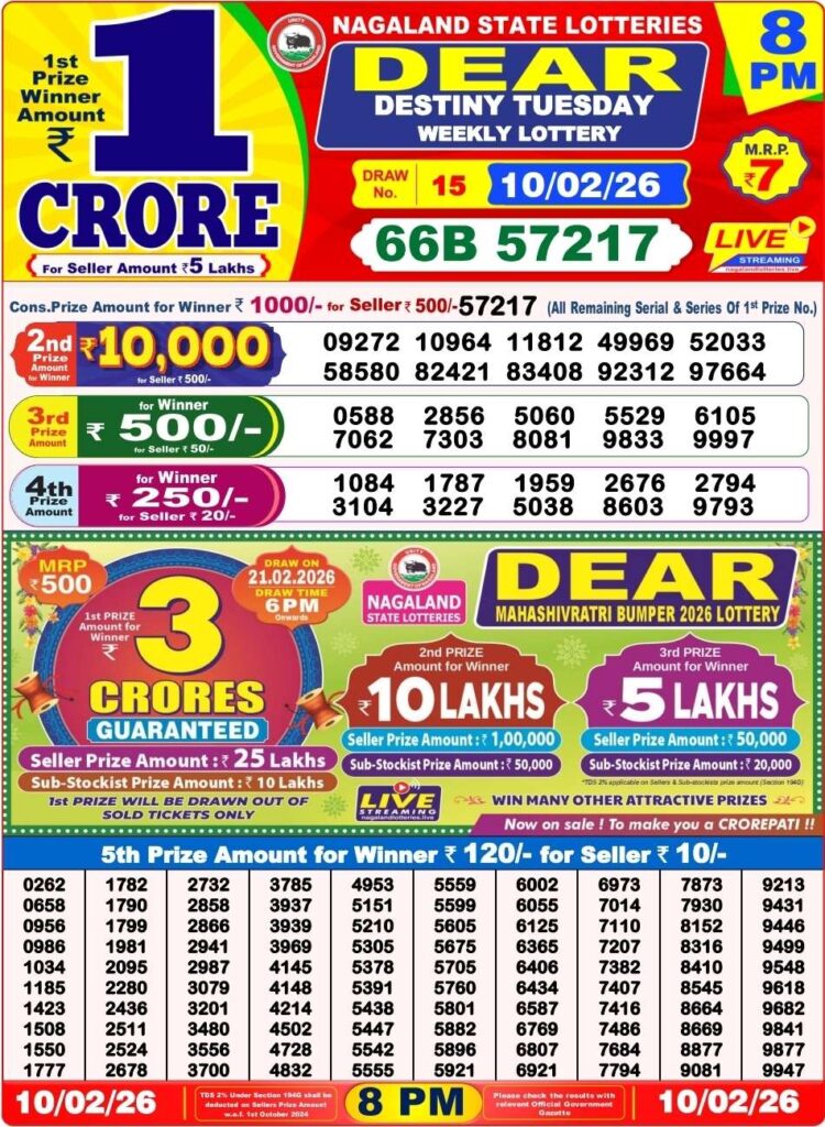 Nagaland State Lottery 11.2.2026 Result 8PM Lottery Sambad Result: Good evening my dear friends there you are landed at the site which will be always been greatly known to be as Dhankesari lottery which is one of the most fastest website in the whole industry of latest lottery sambad results and you know that this can be your life changer oppertunity with the daily basis and there you can win the first prize of 1 crore rupees and this special post made about for the latest Nagaland state lottery 8pm evening and its the another great morning of Tuesday 10th of February 2026 so this special mornings sambad lottery which will be always told to be as it will be Nagaland state lotteries DEAR PARROT EVENING and you know that in this post will be always updated in the best timing at 8:10pm.